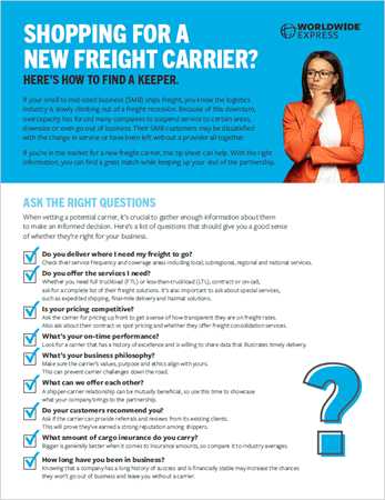 Worldwide Express is a leading third-party logistics provider (3PL) that helps shippers of all sizes move freight efficiently. That includes assisting them in finding carriers that are a good fit for them. To learn what questions you should ask before choosing the right shipping carrier, download our Shopping for a New Freight Carrier Checklist. In this guide, we discuss the importance of asking the right questions in your search for both FTL and LTL shipping carriers, including: