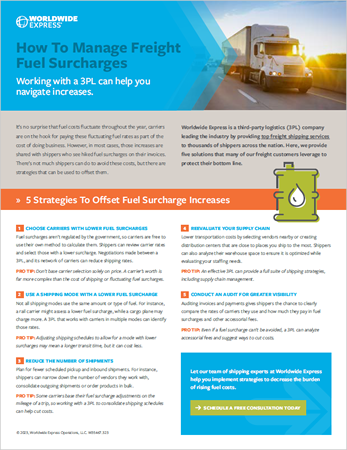 Worldwide Express is an industry-leading third-party logistics (3PL) provider that helps thousands of companies with their freight shipping solutions — that includes building strategies that cut costs. In our guide, How To Manage Freight Fuel Surcharges, we dive into five ways shippers can combat fuel rate hikes and protect their bottom line. The cost-saving measures we focus on are: